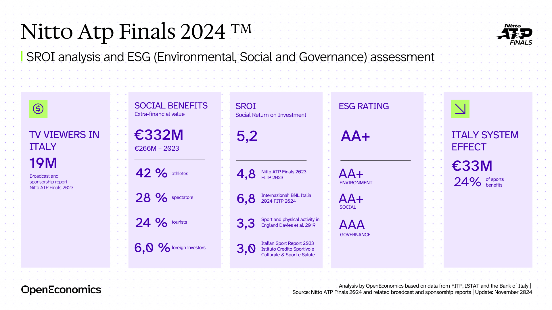 A partnership between the Italian Tennis and Padel Federation (FITP) and OpenEconomics provides a robust evaluation of the economic, social, and environmental value created by the Italian Open in Rome and Nitto ATP Finals in Turin, using internationally recognized indicators like SROI and ESG ratings.