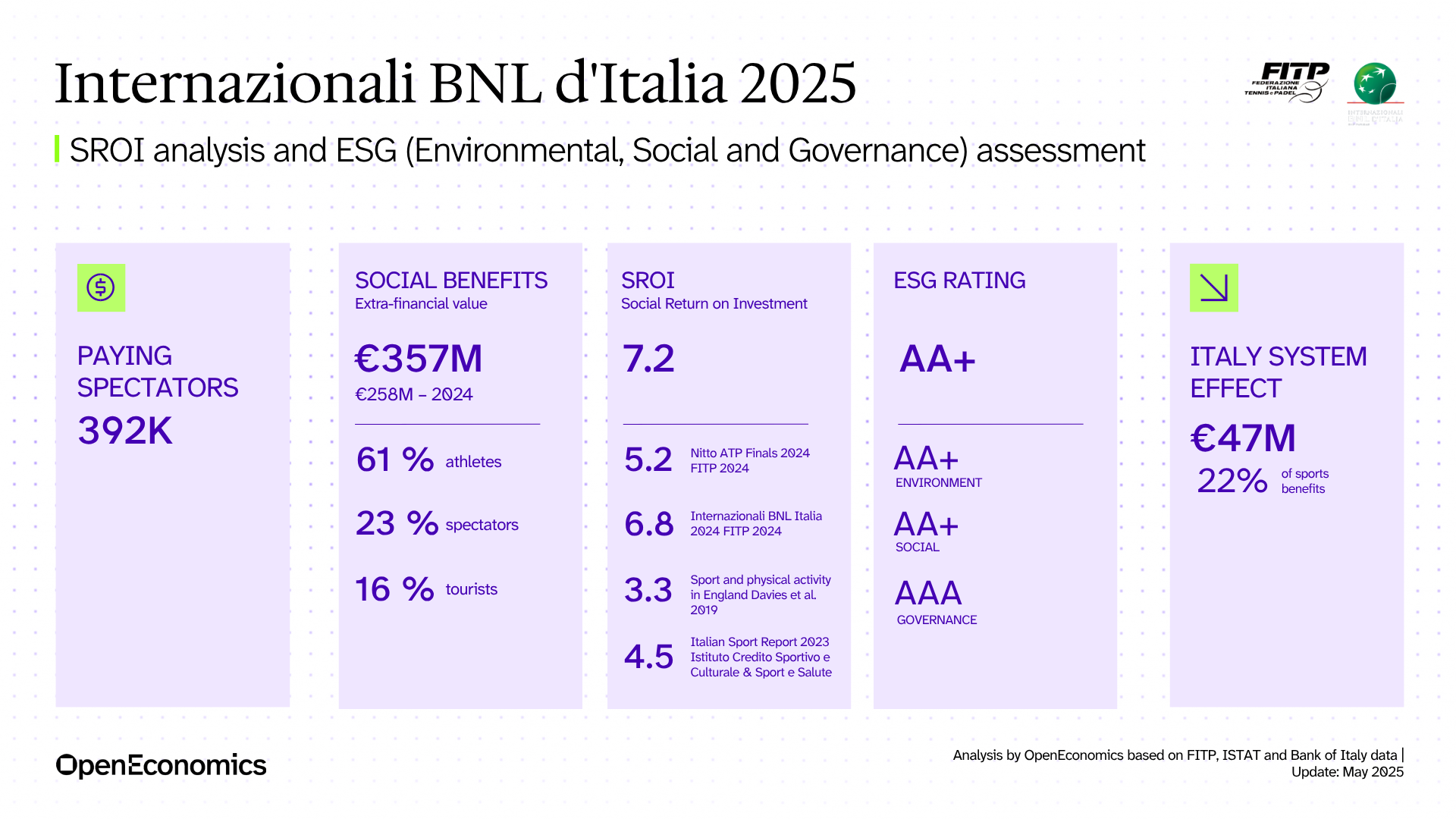 Outcomes are highly favorable compared with benchmarks for major sporting events: SROI of 5.2 for the 2024 Nitto ATP Finals (highest AAA governance rating) and 7.2 for the 2025 Italian Open.