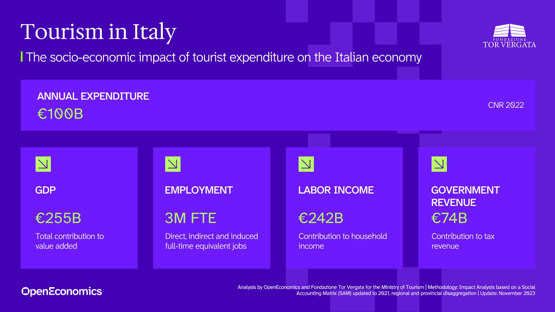 OpenEconomics and Tor Vergata Foundation measured GDP, jobs, and tax revenues from €100B spend in 2022.