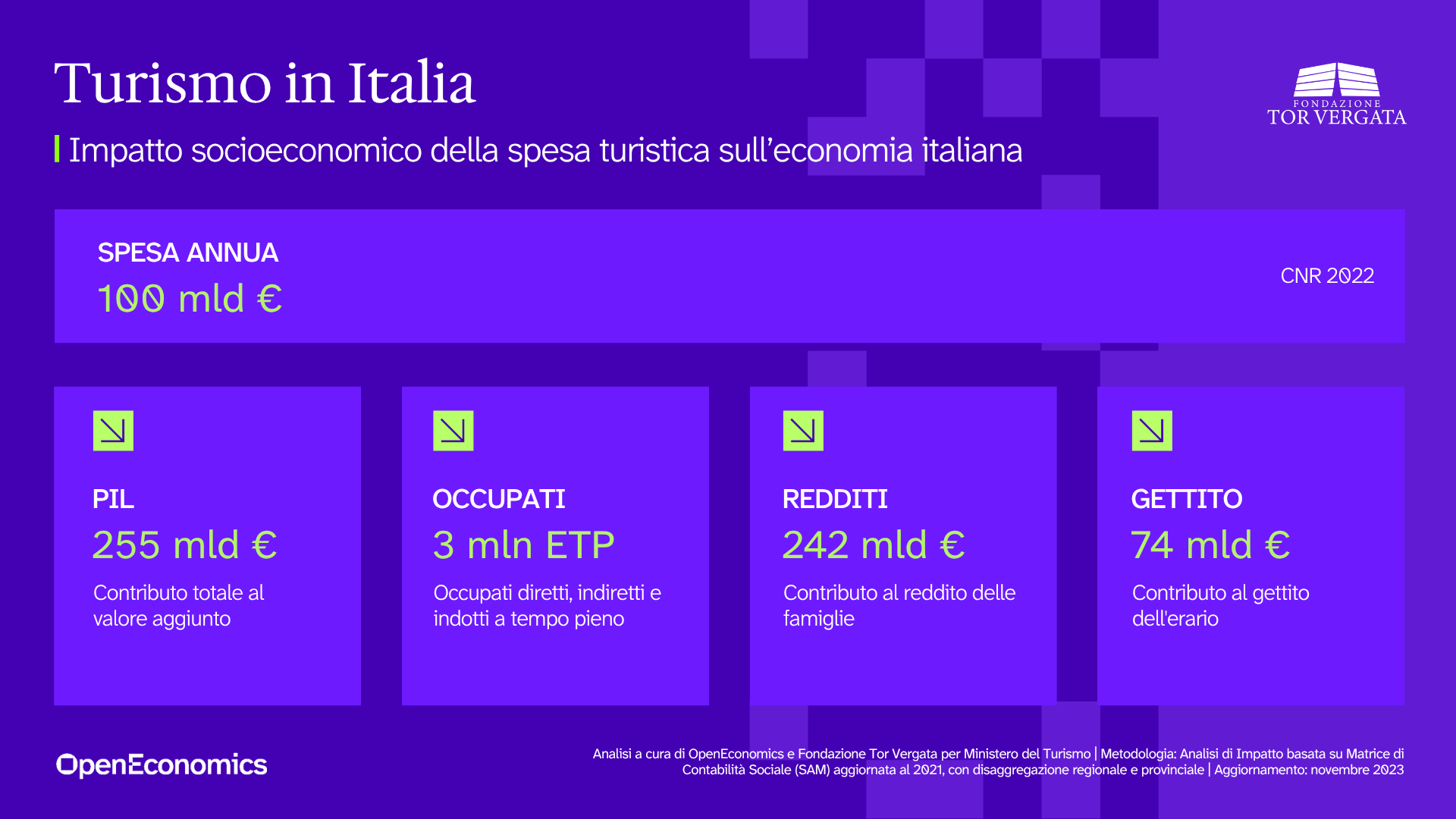 OpenEconomics, in collaborazione con la Fondazione Tor Vergata, ha stimato che nel 2022 la spesa per turismo di 100 miliardi di euro ha generato un impatto sul PIL pari a 255 miliardi di euro